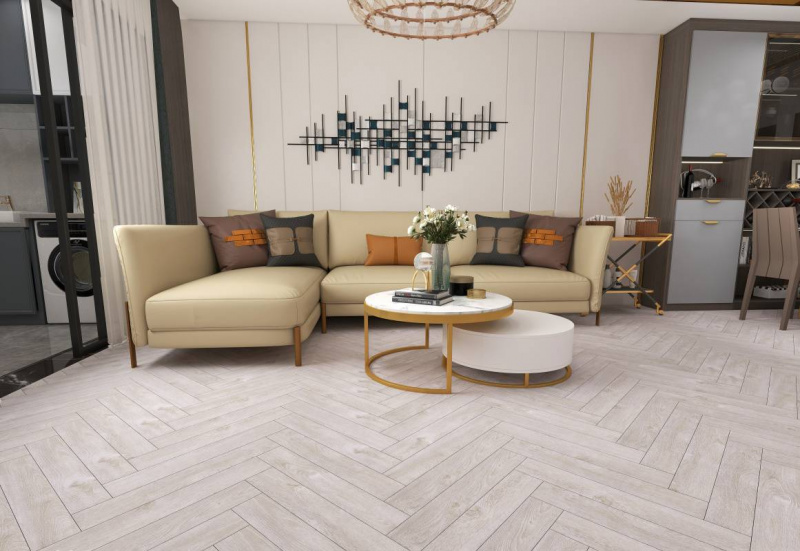 Доски укладываются в стиле «ёлка» при помощи замкового крепления Click. Бесклеевой способ монтажа не требует специальных знаний и инструментов.
